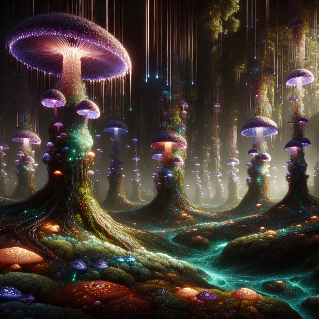 В мире, где солнце скрыто плотными облаками, свет исходит от самих растений. Здесь раскинулся лес невероятных размеров: великанские грибы с фиолетовыми шляпами уходят ввысь, их стволы пронизаны нитями биолюминесцентного света — зелёного, голубого, сиреневого, золотого. По стволам ползут светящиеся существа, похожие на смесь ящеров и бабочек, они мягко шуршат своими тонкими крыльями, сверкая в темноте. Пол леса покрыт живым ковром из мягкого мха, при каждом шаге он слегка светится коралловым оттенком, будто приветствуя гостей из далёких миров. Здесь течёт вода причудливых оттенков — едва колышущиеся бирюзовые струи превращаются в подвесные водопады, их капли, зависая в воздухе, словно горящие жемчужины, неспешно растворяются в пространстве.