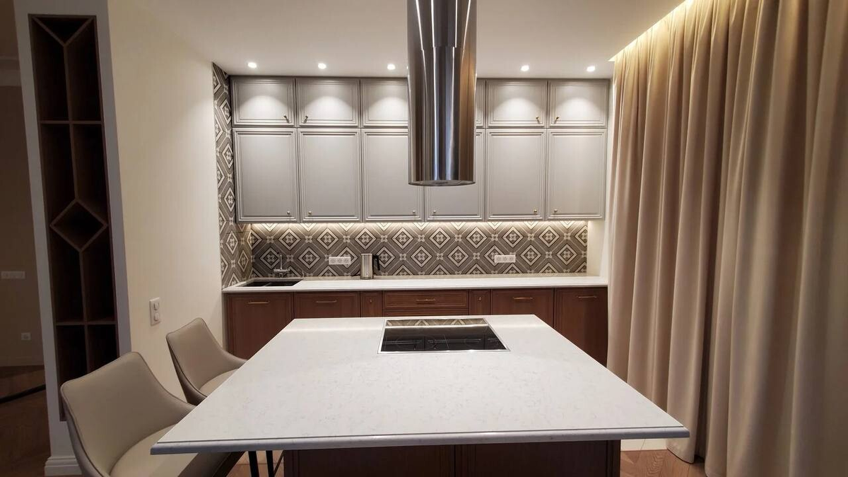 Друзья, думаю, что уже все знают, что при покупке кухни важно учитывать не только внешний вид, но и функциональность. В первую очередь стоит обратить внимание на материалы: плохое качество материала может привести к быстрой износостойкости. Лучше выбрать качественные фасады и столешницы, которые будут устойчивы к повреждениям. Что это может быть за материал? Например, столешницы из кварцевого агломерата. На сегодняшний день это одно из лучших решений, как с эстетической, так и с функциональной точек зрения. В этом проекте, созданным в соавторстве с дизайнером Марией Гасиловой мы использовали кварцевый агломерат Technistone. У него отличная устойчивостью к механическим повреждениям, сколам и царапинам. Он не боится бытовых чистящих средств и воздействия кислот и щелочей, что облегчает уход за ним, менее подвержен загрязнению и образованию пятен от жидкости. Если вы хотите, чтобы ваша кухня была не только стильной, но и удобной в ежедневном использовании, наши специалисты помогут вам в