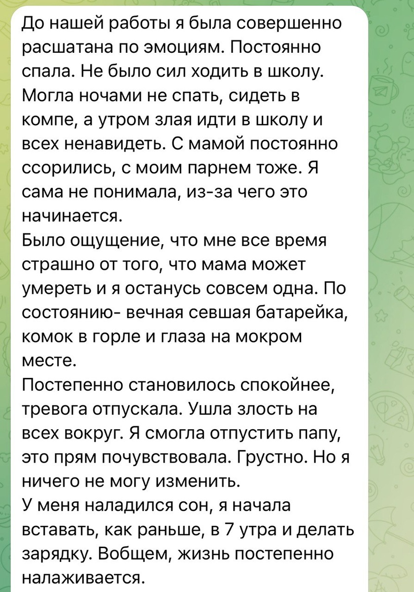 А еще девочка- подросток написала мне, что ее стали раздражать почти все люди вокруг. «Я как будто резко стала ненавидеть всех людей в мире». Постоянное ощущение нехватки сил, «как будто батарейка села». Частые эмоциональные качели. Тревожность моментами зашкаливала «до невероятных размеров». Состояние было близкое к депрессивному, «радости в жизни особо не было». 2,5 года назад не стало папы. В один момент. Трагедия. Жуткая случайность. Через полгода не стало любимой бабушки. Потом деда. В нашей психике есть встроенный механизм переработки горя. Но когда таких трагедий несколько за короткое время, то психика не выдерживает. И не справляется. И тогда горевание становится ПАТОЛОГИЧЕСКИМ. Это значит, что человек никак не может адаптироваться к жизни без близкого человека (даже если это развод и все живы). Продолжает винить себя в его уходе, постоянно прокручивает в голове мысли о том, что можно было бы сделать, чтобы было по- другому. Злится на себя, на ушедшего, на всех вокруг. Видит ко