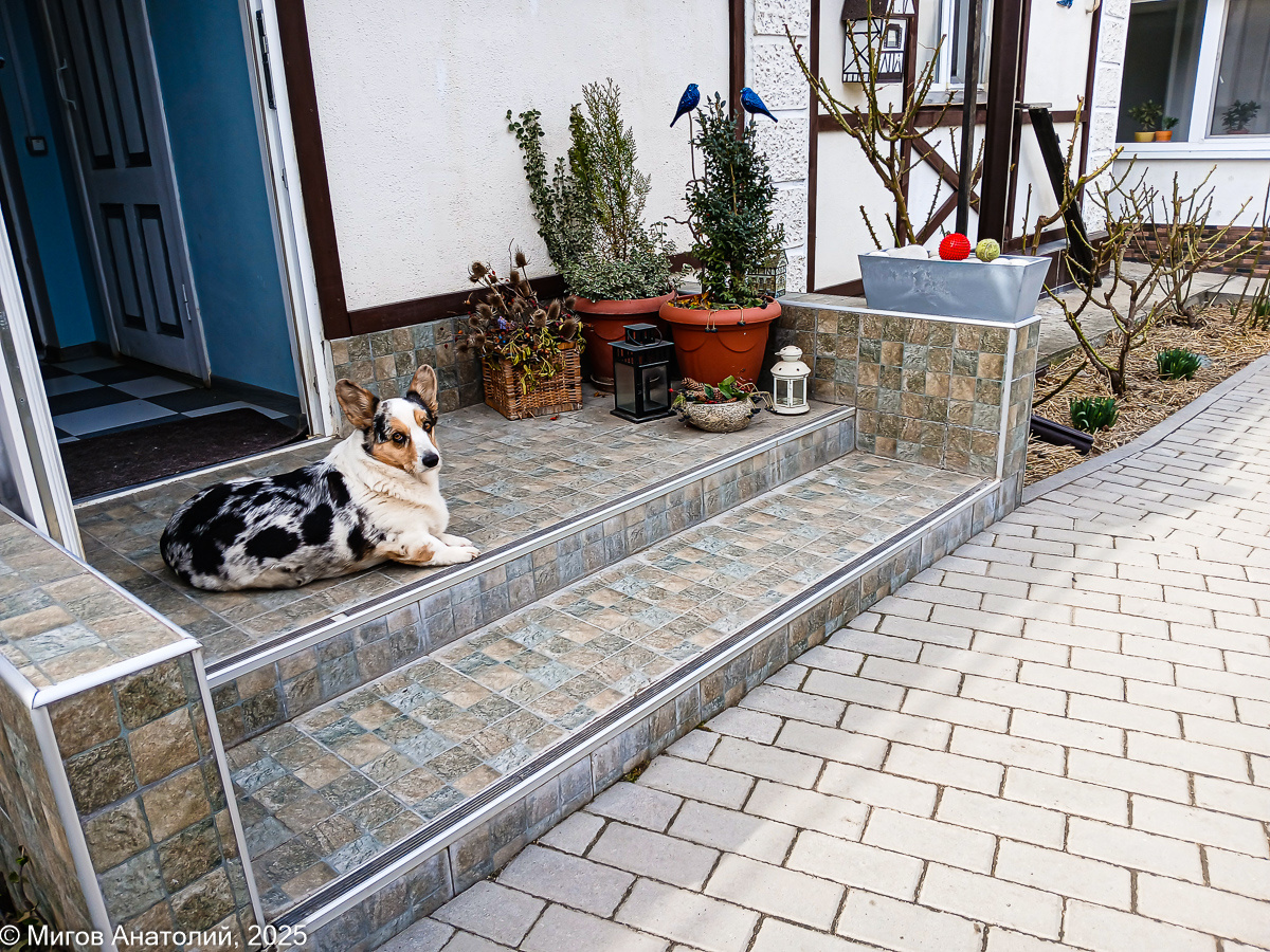 На нашем парадном крыльце растет в горшке небольшая восточная туя. Всего у нас в саду девять таких туй. Все они были куплены, чтобы создать живое зеленое ограждение по краю участка. Но эта туя, единственная, которая появилась сама собой. Упало на землю семечко с одного из взрослых деревьев и проросло. Лена заметила этот росток и перенесла его в горшок. Затем подсадила туда же хвостик бересклета и мы поставили этот горшок на крыльцо. Летом тут стоят другие растения, в основном герани, а это зимний вариант: вечнозеленые самшит, бересклет, восточная туя. И ещё букет из сухих колючек и плодов. Вот-вот придёт время менять зимнюю композицию на летнюю. А поскольку сейчас хорошее время для садовых посадок и пересадок, мы решили эту тую определить на постоянное место жительства. Горшок с землёй очень большой и довольно тяжёлый, поэтому, чтобы не таскать его туда-сюда, я решил вынуть из него тую прямо тут же на крыльце. Подстелил плёнку, чтобы не извазюкать парадный вход, повалил горшок, обстук