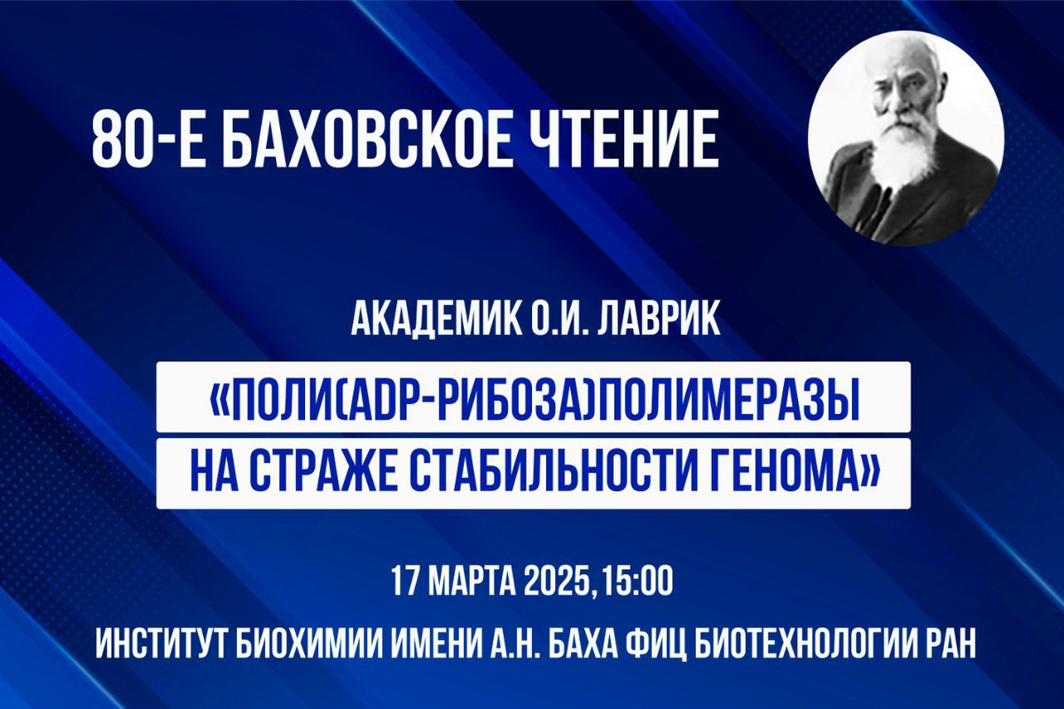17 марта 2025 года в ФИЦ Биотехнологии РАН состоится юбилейное 80-е Баховское чтение. На чтениях академик О.И. Лаврик выступит с лекцией «Поли(adp-рибоза)полимеразы на страже стабильности генома». Билет на 80-е Баховское чтение. Вход свободный! Онлайн трансляция Чтений будет доступна на сайте ФИЦ Биотехнологии РАН Дата и время проведения: 17 марта 2025 года в 15:00 Место проведения: Конференц-зал Института биохимии имени А.Н. Баха ФИЦ Биотехнологии РАН (г. Москва, Ленинский проспект, дом 33, стр. 2)
