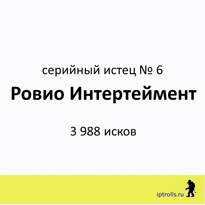 Мы собрали информацию о правообладателях, массово подающих претензии и иски в защиту авторских прав и прав на товарные знаки, а также полезные материалы и рекомендации, чтобы вы могли: разобраться в вопросе нарушений интеллектуальных прав правильно отреагировать на требования правообладателя избежать претензий в будущем Сейчас в базе 60+ серийных истцов. Вы можете проверить, не нарушаете ли вы чьи-то интеллектуальные права в рамках своего бизнеса или проекта, получить ответы на популярные вопросы и проконсультироваться. Правообладатель Ровио Интертеймент внесен в базу IPTrolls под № 6. Переходи в карточку правообладателя на сайте IPTrolls, чтобы узнать больше. Если вы не нашли ответ на свой вопрос, посмотрите другие материалы проекта или напишите нам через форму на сайте. _____________________ команда проекта IPTrolls 🕵🏻♂️Следите за обновлением базы