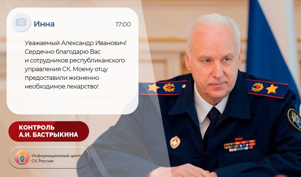 Вскоре домой позвонили, мужской голос представился сотрудником следственного управления СК России по Республике Башкортостан. Оказалось, что решение вопроса ее папы Александр Иванович Бастрыкин взял на личный контроль. Проблема, как оказалось, состояла в человеческой безответственности – закупленные лекарства просто не привозили в Салават из Уфы. Но теперь вопрос был решён, необходимый препарат можно было забрать в аптеке.