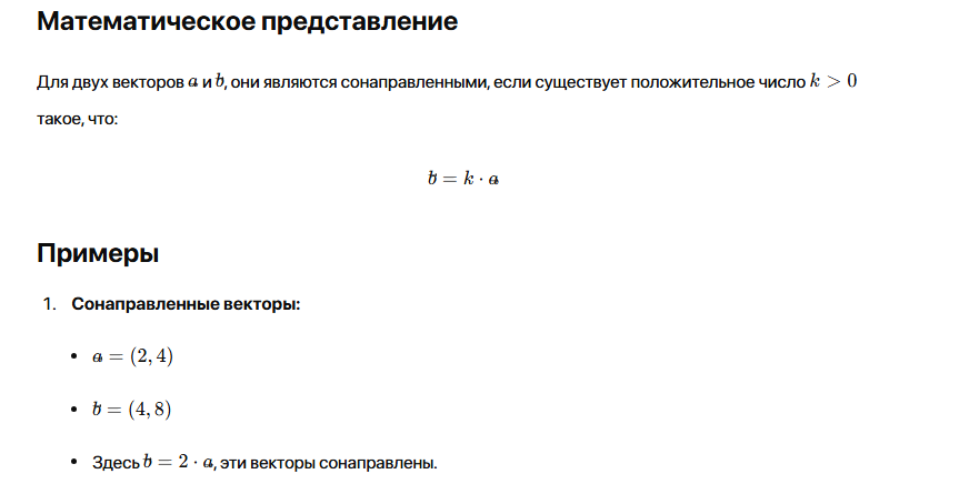 Сонаправленные векторы — это два или более вектора, которые указывают в одном и том же направлении. Они могут отличаться по длине, но их направления совпадают. Вектор можно представить как стрелку, имеющую направление и длину. Сонаправленные векторы выглядят как стрелки, направленные в одну сторону, даже если они различаются по длине. Сонаправленные векторы играют важную роль в различных областях математики, физики и инженерии, позволяя анализировать направления сил, движений и других векторных величин.