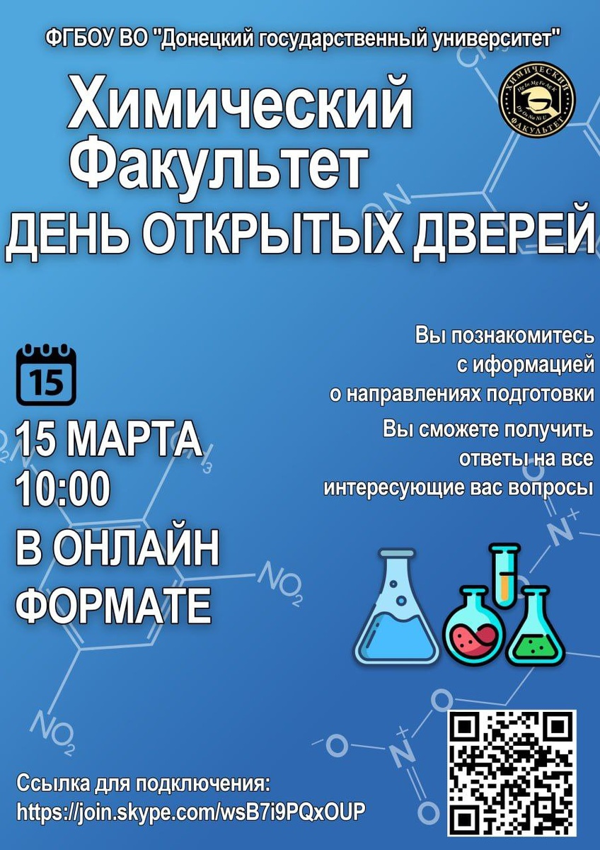 Химический факультет Донецкого государственного университета приглашает абитуриентов, учителей, родителей на День открытых дверей, который состоится 15 марта в 10.00 в онлайн-формате. Абитуриенты смогут узнать об особенностях обучения на факультете, направлениях подготовки и специальностях, на которые можно поступать в 2025 году, задать вопросы, касающиеся вступительной кампании, организации учебного процесса, научной деятельности, а также участия в общественной жизни факультета. Ссылка для подключения в Skype: https://join.skype.com/wsB7i9PQxOUP