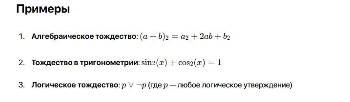 Тождество — это математическое утверждение, которое истина независимо от значений переменных. В основном используется в алгебре и логике. Тождества играют важную роль в различных областях математики, таких как: