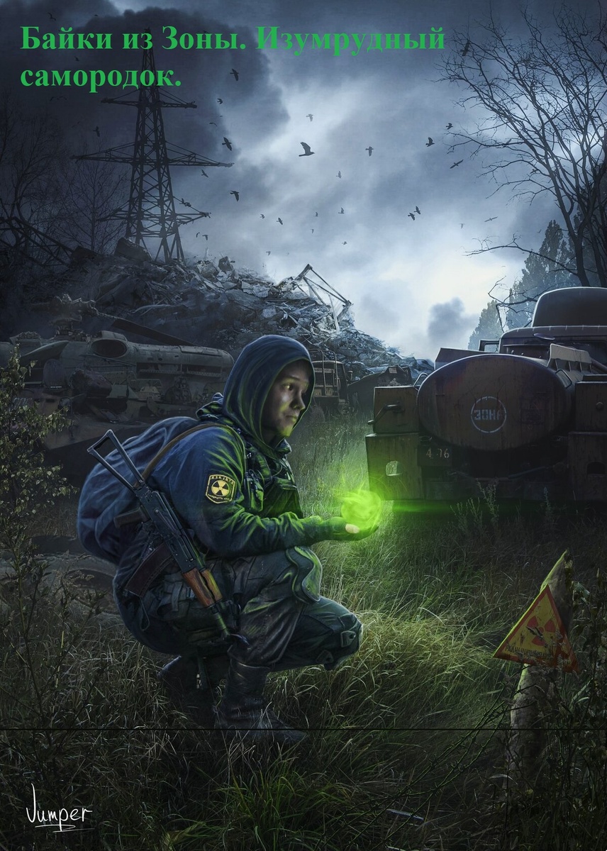 С недавних пор в сталкерских кругах стала ходить история про артефакт под названием "Изумрудный самородок". Не многие, которые видели его воочию, рассказывали о небывалой красоте. Он представлял собой небольшой кристалл изумрудного цвета. Артефакт усиливал все физические свойства своего носителя. Вдобавок он помогал бороться с радиацией и пси воздействием. И все бы ничего, но через время у носителя артефакта, проявлялась чудовищная агрессия в отношении ближних. В лучшем случае, дело заканчивалось мордобоем, а в худшем... Сталкеры начинали теряться в пространстве. В голове начинал происходить странный треск переходящий в вой... Историю эту, я услышал в баре, будучи подручным Бармена. На дворе стояла поздняя осень. Деревья уже были лысыми, как призывники в военкомате. Небо затянули синие тучи, временами выплескивая на землю несколько сотен литров воды. Я только недавно вернулся с Агропрома. Передал бумажки Бармена заинтересованным людям. Вечер был свободный. Закупившись Жигулевским, грен