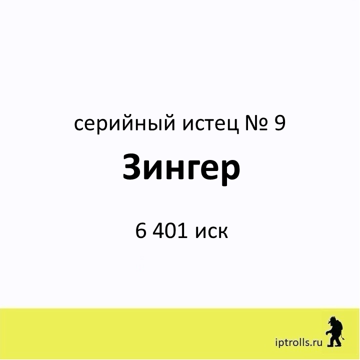 Мы собрали информацию о правообладателях, массово подающих претензии и иски в защиту авторских прав и прав на товарные знаки, а также полезные материалы и рекомендации, чтобы вы могли: разобраться в вопросе нарушений интеллектуальных прав правильно отреагировать на требования правообладателя избежать претензий в будущем Сейчас в базе 60+ серийных истцов. Вы можете проверить, не нарушаете ли вы чьи-то интеллектуальные права в рамках своего бизнеса или проекта, получить ответы на популярные вопросы и проконсультироваться. Правообладатель Зингер внесен в базу IPTrolls под № 9. Переходи в карточку правообладателя на сайте IPTrolls, чтобы узнать больше. Если вы не нашли ответ на свой вопрос, посмотрите другие материалы проекта или напишите нам через форму на сайте. _____________________ команда проекта IPTrolls 🕵🏻♂️Следите за обновлением базы