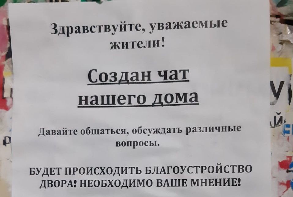 На подъездах тульских многоэтажек появились объявления следующего содержания: «Создан чат нашего дома! Давайте общаться, обсуждать различные вопросы. Будет происходить благоустройство двора, необходимо ваше мнение!»