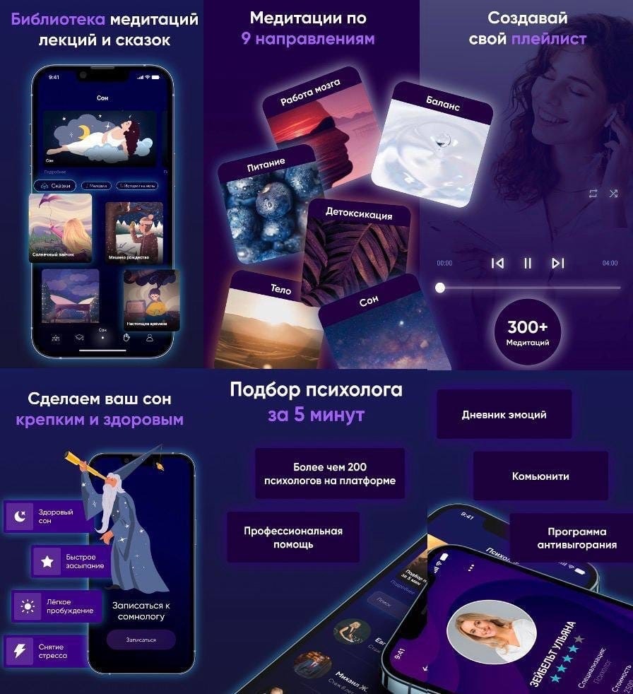 ✅ Медитации – голосовые и музыкальные, с возможностью выбора по категории и длительности.