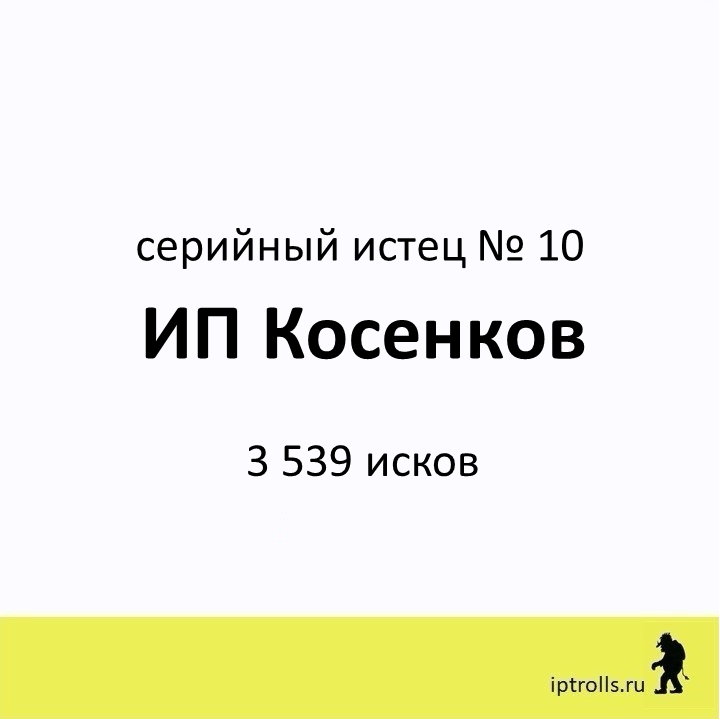 Мы собрали информацию о правообладателях, массово подающих претензии и иски в защиту авторских прав и прав на товарные знаки, а также полезные материалы и рекомендации, чтобы вы могли: разобраться в вопросе нарушений интеллектуальных прав правильно отреагировать на требования правообладателя избежать претензий в будущем Сейчас в базе 60+ серийных истцов. Вы можете проверить, не нарушаете ли вы чьи-то интеллектуальные права в рамках своего бизнеса или проекта, получить ответы на популярные вопросы и проконсультироваться. Правообладатель ИП Косенков внесен в базу IPTrolls под № 10. Переходи в карточку правообладателя на сайте IPTrolls, чтобы узнать больше. Если вы не нашли ответ на свой вопрос, посмотрите другие материалы проекта или напишите нам через форму на сайте. _____________________ команда проекта IPTrolls 🕵🏻♂️Следите за обновлением базы