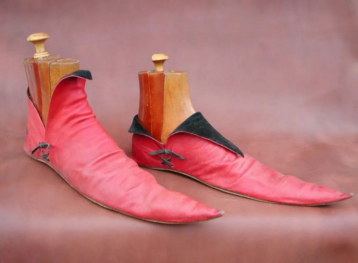 Начнём с XIV века, когда в Европе вошли в моду пулены — туфли с длиннющими носами, которые иногда достигали полуметра! Их носили и мужчины, и женщины, но дамы особенно старались выделиться. Чтобы носы не гнулись и не падали, их набивали мхом или шерстью, а иногда даже привязывали к коленям шнурками. Представьте себе: идёте вы по средневековой улице, а перед вами дама, у которой обувь длиннее, чем её юбка. И это считалось писком моды!