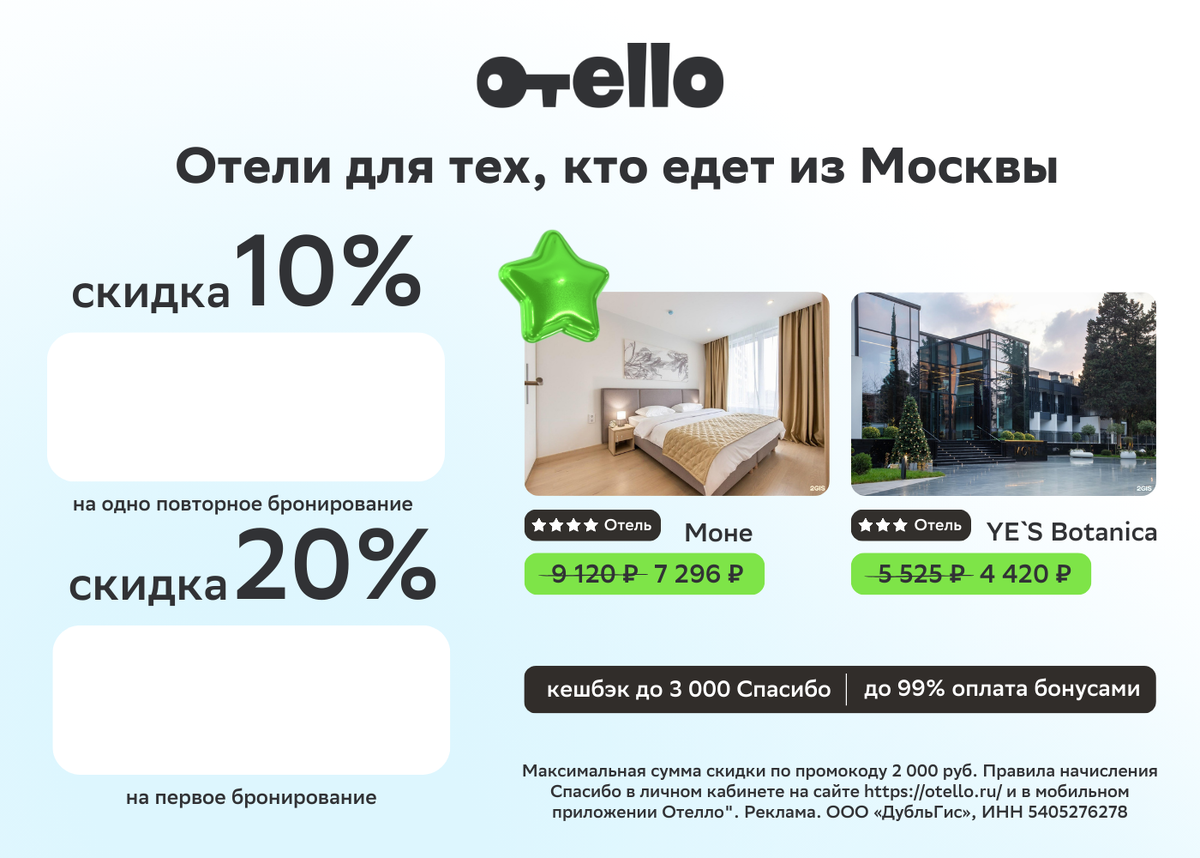 💚 RAW1198 - скидка 10% на одно повторное бронирование. Максимальная сумма скидки - 2000 рублей.