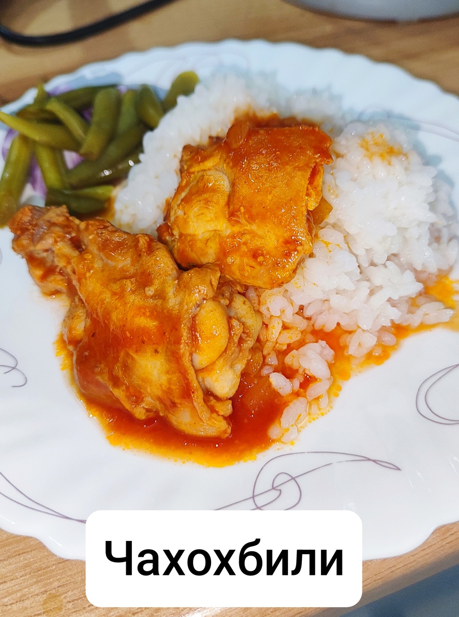 А на ужин чахохбили 😋 Курицу без кожи солим, перчим и обжариваем на сковороде. Обдаем наливочкой из черноплодки с ментолом😜 либо любым сухим, красным вином. Нарезаем репчатый лук и обжариваем всё вместе 10 минут до золотистого цвета. Заливаем томатный сок, солим на вкус Тушим 30 минут на слабом огне За 5 минут до готовности кладём лимон и чеснок. Приложение к гарниру: варено-маринованная в соевом соусе Сакса (замороженная с моей любимой дачи) Приятного аппетита 🤗 👍