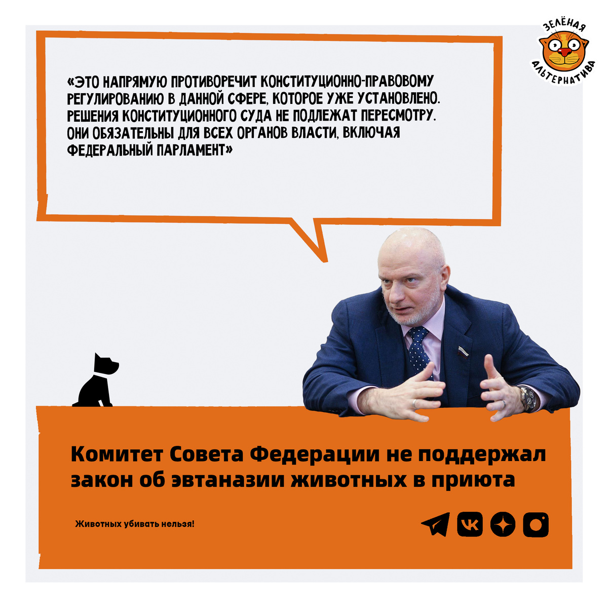 Скандальный законопроект об исключении действующего правила возврата бездомных животных в естественную среду обитания после отлова и передержки в приютах, а также их умерщвлении был забракован комитетом Совфеда по конституционному законодательству и государственному строительству. Озлобившиеся на четвероногих депутаты Госдумы предлагают дать регионам право убивать хвостатых после установленного срока пребывания в пунктах передержки. «Это напрямую противоречит конституционно-правовому регулированию в данной сфере, которое уже установлено. Решения Конституционного суда не подлежат пересмотру. Они обязательны для всех органов власти, включая федеральный парламент», — заявил глава комитета Совета Федерации по конституционному законодательству и государственному строительству Андрей Клишас. Человечность и здравомыслие не покинули высшие государственные умы нашей страны, и надежда на спасение жизней сотен тысяч братьев меньших ещё есть. Животным можно облегчить страдания и отправить в послед
