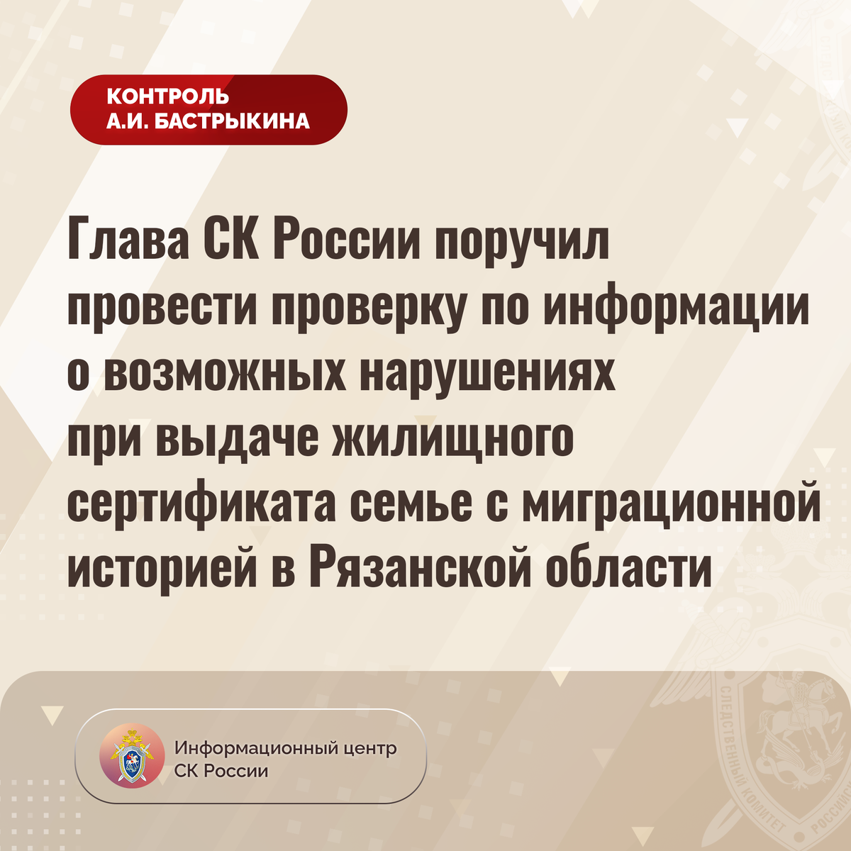 Глава СК России поручил провести проверку по информации о возможных нарушениях при выдаче жилищного сертификата семье с миграционной историей в Рязанской области В СМИ сообщается о несогласии общественности с предоставлением администрацией Скопинского района Рязанской области жилищного сертификата на крупную сумму семье мигрантов из Узбекистана. Несмотря на то, что местные жители, нуждающиеся в улучшении жилищных условий, годами ожидают своей очереди, решение принято в пользу семьи с миграционной историей. Граждане усматривают в действиях администрации коррупционную составляющую. Председатель Следственного комитета Российской Федерации Александр Иванович Бастрыкин поручил и.о. руководителя СУ СК России по Рязанской области Алексею Андреевичу Медведкову провести процессуальную проверку и доложить об установленных в ходе первоначальных проверочных мероприятий обстоятельствах, а по завершении процессуальной проверки – о ее результатах. Исполнение поручения, а также ход процессуальной пров