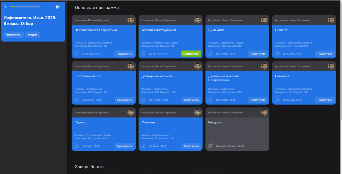 Немного из текущего. Я об этом тоже писала уже не раз, что регистрирую сына регулярно на очень многие смены в Сириус по направлению НАУКА. Подборка моих статей про Сириус: ( Ни к чему это человека не обязывает, регистрирую иногда и на 2 программы в один месяц. Это только дает возможность пройти курсы, иногда не последовательно, как в Сириус курсах, а как-то выборочно и попробовать себя в заочном отборе, очный как правило проходит в другом городе и поэтому я до такого еще не созрела, чтобы просто съездить пописать отбор Сириуса, зная, что дальше человек не пойдет, не потому что не хочет, а потому что ограничения, или совпадения. ) Допустим сейчас отбор на смены по информатике: Что для меня стало "открытием" с этой сменой, что 8 класс только на C++ (на самом деле, это наверное правильно, если задуматься по хорошему). В прошлом году сын делал этот "курс" там все было на питоне. Еще немного про Сириус и информатику. В чате Сириуса в ТГ в этом году люди удивлялись, какой проход по академиче