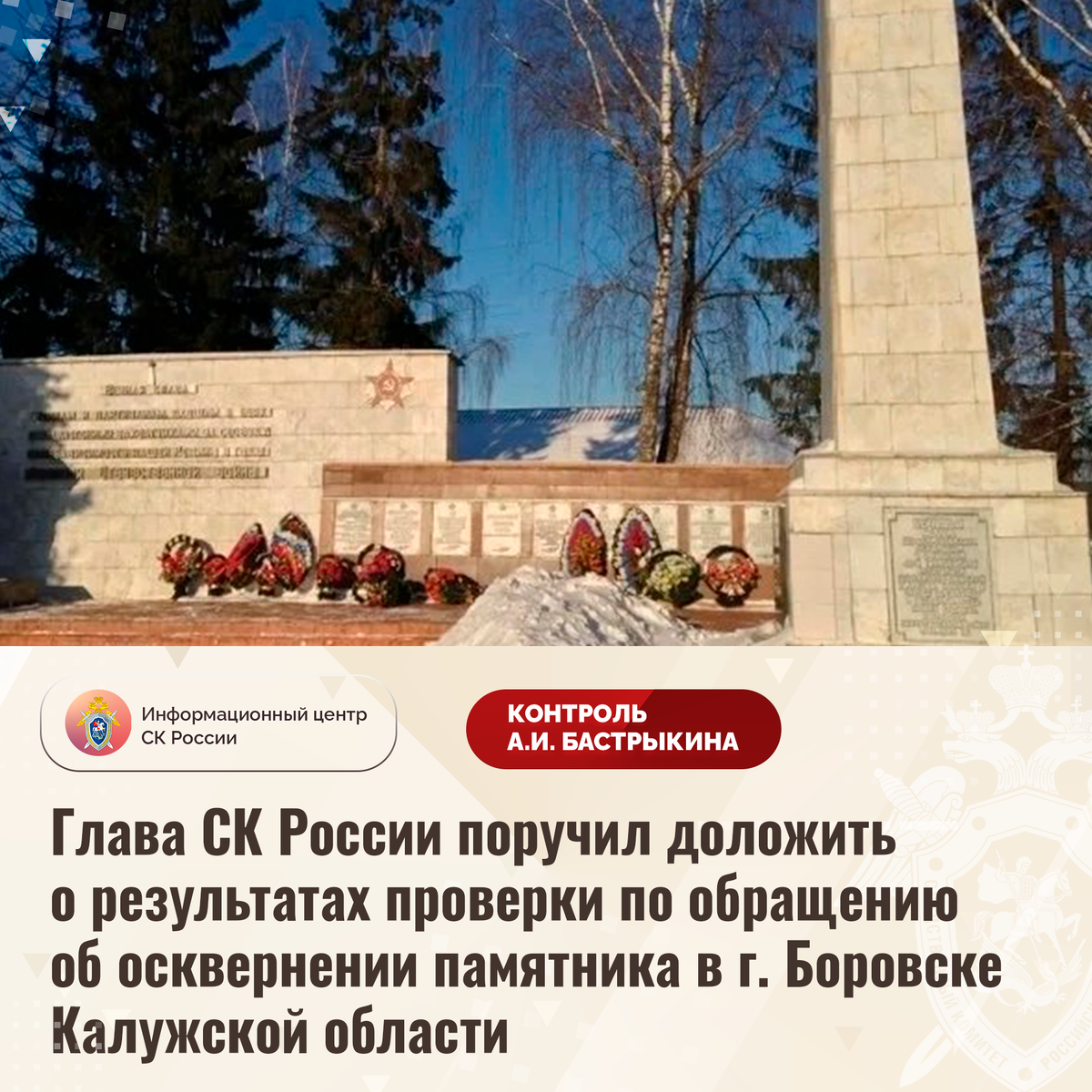 Глава СК России поручил доложить о результатах проверки по обращению об осквернении памятника в г. Боровске Калужской области