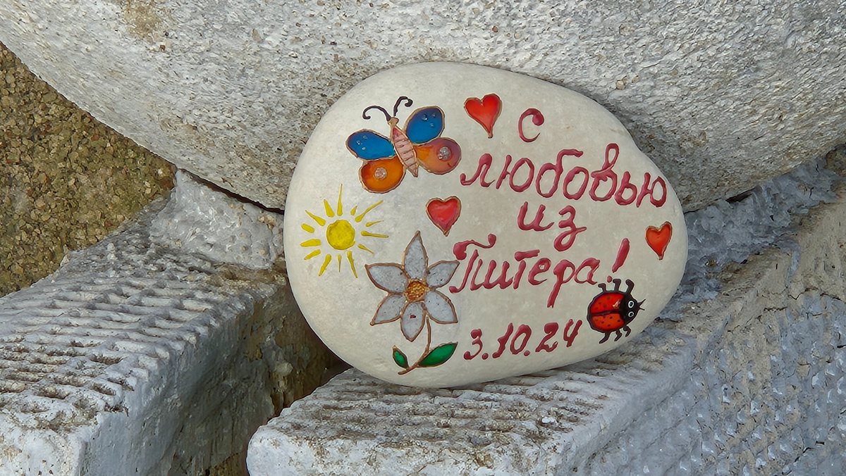 Всем привет! Ребята, спасибо! Неизвестные авторы оставили очень яркое и красивое послание из летнего теплого октября 2024 года. В минувшем году октябрь выдался просто невероятно прекрасным. Теплый и солнечный месяц очевидно стал одним из факторов, ставших мотивацией для создания этого письма! Красивая бабочка, солнышко, цветочек абелии (ваши варианты, а если найдется автор послания - сообщите, что за цветок!). Сердечки и божья коровка! Очевидно, что автор (авторы) постарались передать атмосферу отдыха! Спасибо жителям Санкт-Петербурга! Прошло пять месяцев! Ваше послание стоит на подпорной стене "лицом" к морю. Каждый день послание видят сотни прогуливающихся на пляже, никто не унес его домой. Камень по-прежнему украшает набережную! Кто бы ты не был, инициатор создания этого произведения искусства, знай, что этот камень поднял настроение команде туристского клуба из "Сириуса", которой камушек поддержал прекрасное настроение!