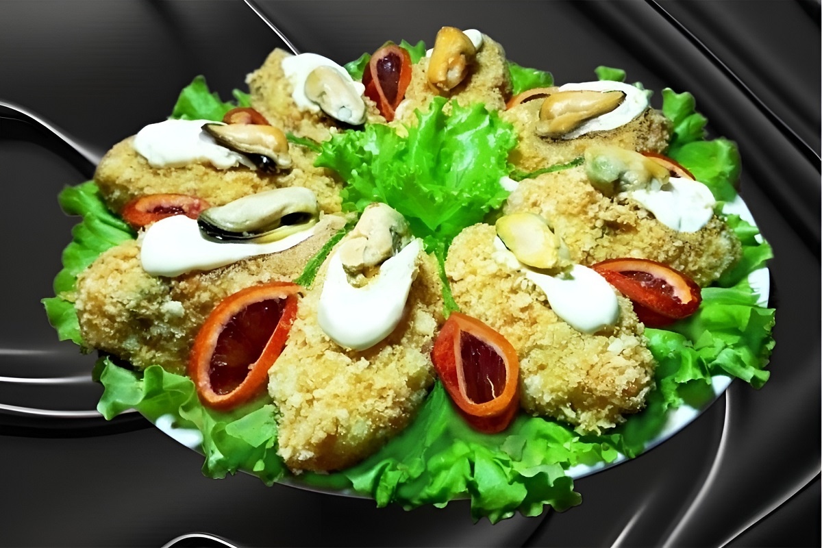 Выкладываем получившиеся изделия на блюдо, покрытое свежей зеленью (в оригинале руккола, но можно использовать любую: листовой салат, петрушку, укроп и т.д.). Сверху, на каждую порцию добавляем соус, а на него одну целую мидию: