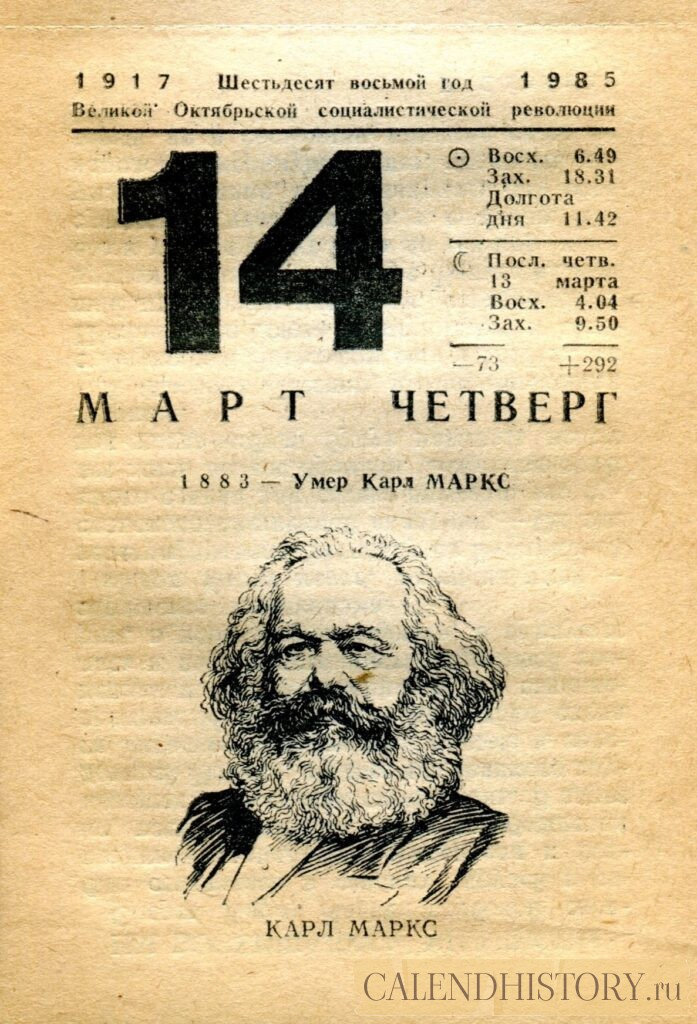 Итак, сегодня 14-го марта и у нас на календаре 1985-й год. Перед нами листок советского календаря для женщин. На календаре у нас четверг - 14 марта 1985-го года. 1883 — Умер Карл МАРКС КАРЛ МАРКС *** Оборотную сторону листка этого календаря можно посмотреть у нас по ссылке на сайте. Другие листки советских календарей смотрите у нас на сайте - CALENDHISTORY.ru ПОСМОТРИТЕ ЕЩЁ ЛИСТКИ ОТРЫВНЫХ КАЛЕНДАРЕЙ: