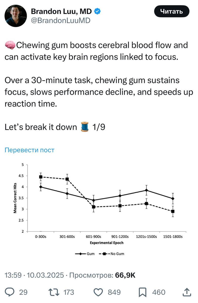 Π£ΡΡΠ½ΡΠ΅ ΠΏΡΠΈΡΠ»ΠΈ ΠΊ ΡΠ΄ΠΈΠ²ΠΈΡΠ΅Π»ΡΠ½ΠΎΠΌΡ Π²ΡΠ²ΠΎΠ΄Ρ: Π²ΡΠ΅Π³ΠΎ 30 ΠΌΠΈΠ½ΡΡ ΠΆΠ΅Π²Π°Π½ΠΈΡ ΠΆΠ²Π°ΡΠΊΠΈ ΠΌΠΎΠ³ΡΡ Π·Π½Π°ΡΠΈΡΠ΅Π»ΡΠ½ΠΎ ΡΠ»ΡΡΡΠΈΡΡ ΡΠ°Π±ΠΎΡΡ ΠΌΠΎΠ·Π³Π°. Π ΡΠ΅Π·ΡΠ»ΡΡΠ°ΡΠ΅ ΡΠΊΡΠΏΠ΅ΡΠΈΠΌΠ΅Π½ΡΠ° Π²ΡΡΡΠ½ΠΈΠ»ΠΎΡΡ, ΡΡΠΎ ΠΆΠ΅Π²Π°Π½ΠΈΠ΅ ΠΆΠ²Π°ΡΠΊΠΈ ΡΠ²Π΅Π»ΠΈΡΠΈΠ²Π°Π΅Ρ Π²Π½ΠΈΠΌΠ°Π½ΠΈΠ΅, ΡΠ΅Π°ΠΊΡΠΈΡ ΠΈ ΠΏΡΠΎΠ΄ΡΠΊΡΠΈΠ²Π½ΠΎΡΡΡ Π½Π° 20%. π§ ΠΡΡΠ»Π΅Π΄ΠΎΠ²Π°Π½ΠΈΠ΅ ΠΏΡΠΎΠ²ΠΎΠ΄ΠΈΠ»ΠΎΡΡ Π½Π° 40 ΡΡΠ°ΡΡΠ½ΠΈΠΊΠ°Ρ