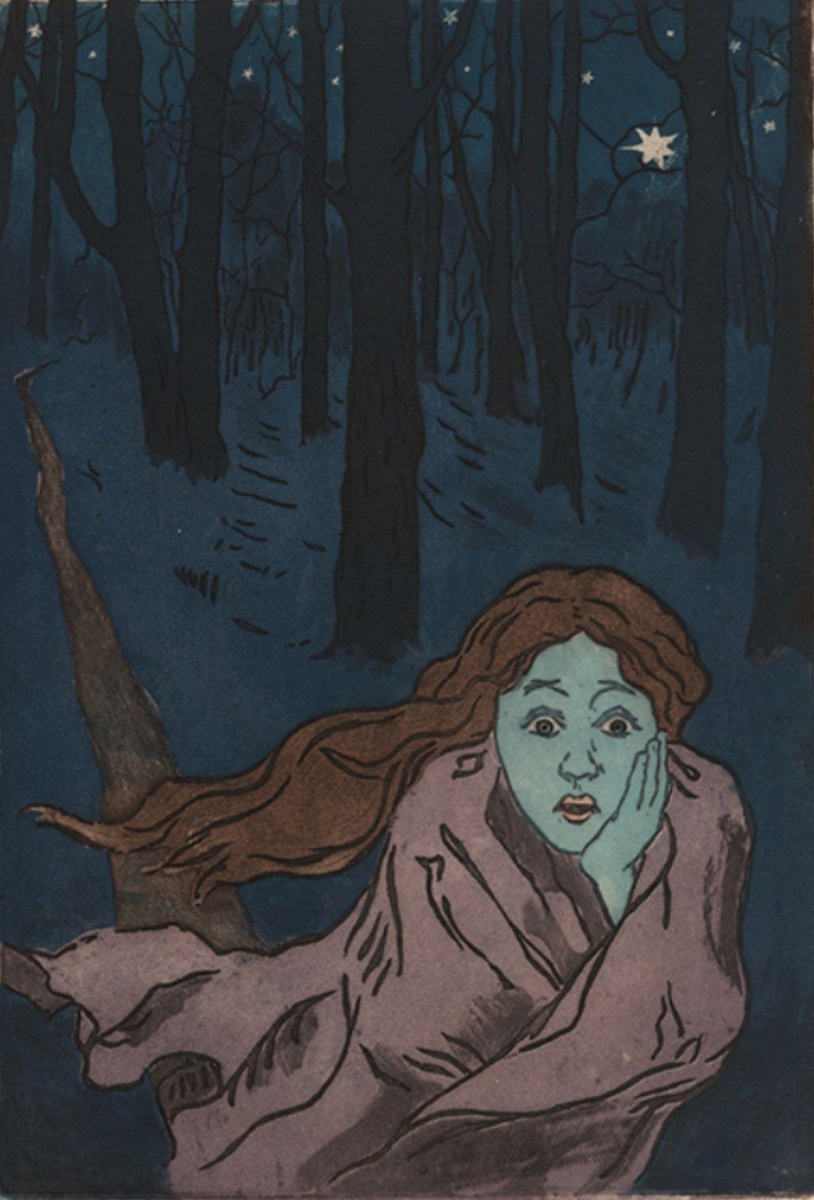 Центральный образ: На переднем плане изображена женщина с испуганным выражением лица, укутанная в плащ или покрывало. Её лицо окрашено в тревожный синевато-зелёный оттенок, а глаза широко раскрыты — её взгляд передаёт чувство паники или ужаса.