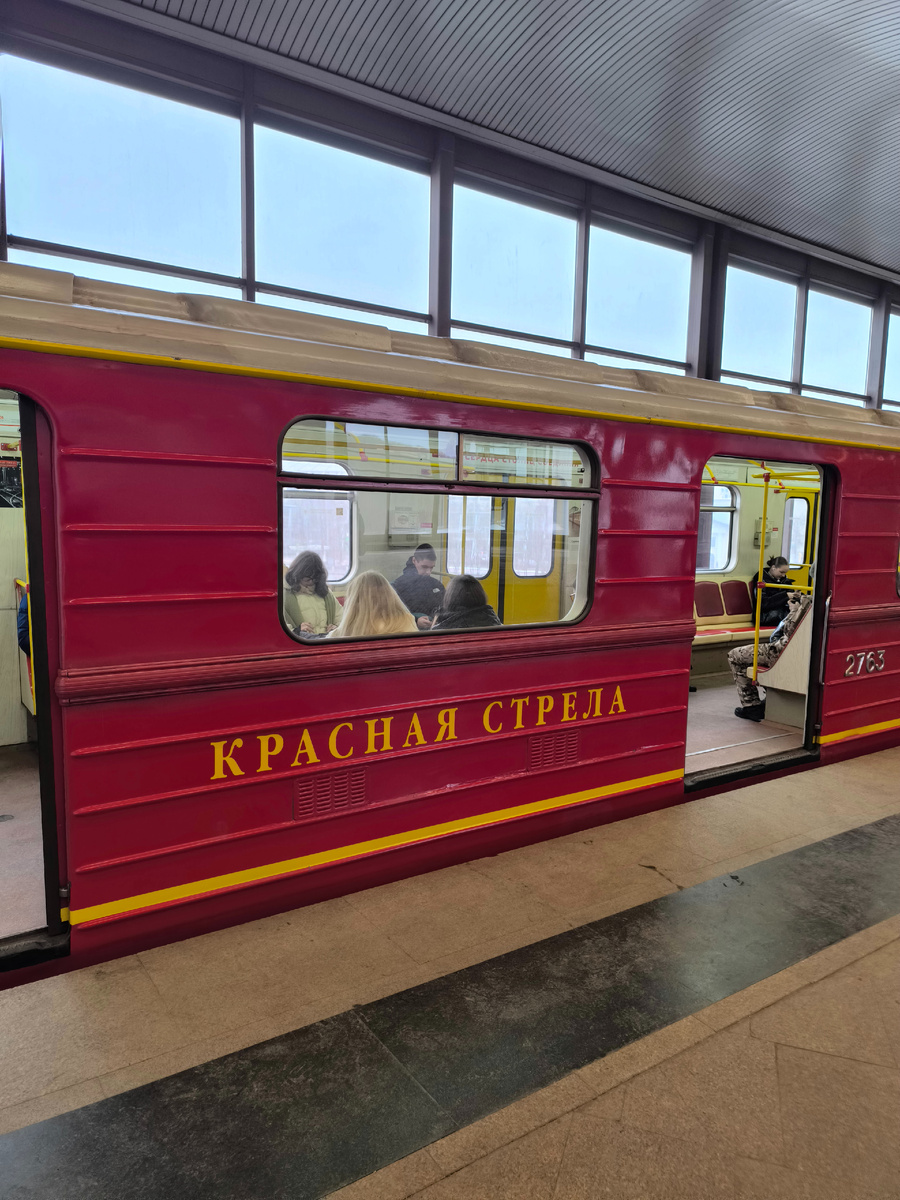 На этот вопрос легко могут ответить мамы некоторых мальчиков, сами мальчики, интересующиеся темой московского транспорта и знатоки именных поездов метро. Это названия двух знаменитых именных поездов, курсирующих по красной ветке знаменитого московского метро. В один прекрасный день, после посещения государственного музея имени А. С. Пушкина, усталая и довольная я оказалась в знаменитом именном поезде "Красная стрела". Самый старый из действующих именных поездов в Московском метро. Поезд был запущен по заказу ОАО «РЖД» на Сокольнической линии 9 октября 2006 года в честь 75-й годовщины первого фирменного поезда «Красная стрела». Внешний вид состава разработан в специальном конструкторском бюро (СКБ) АО «Метрованонмаш». Снаружи поезд окрашен в красный цвет вместо обычного синего, горизонтальная полоса жёлтая вместо белой, крыши вагонов серебристые, на дверях вместо обычного рисунка стилизованное число 75. Внутри — жёлтые поручни, красные сиденья, на стенах расклеены материалы об истории п