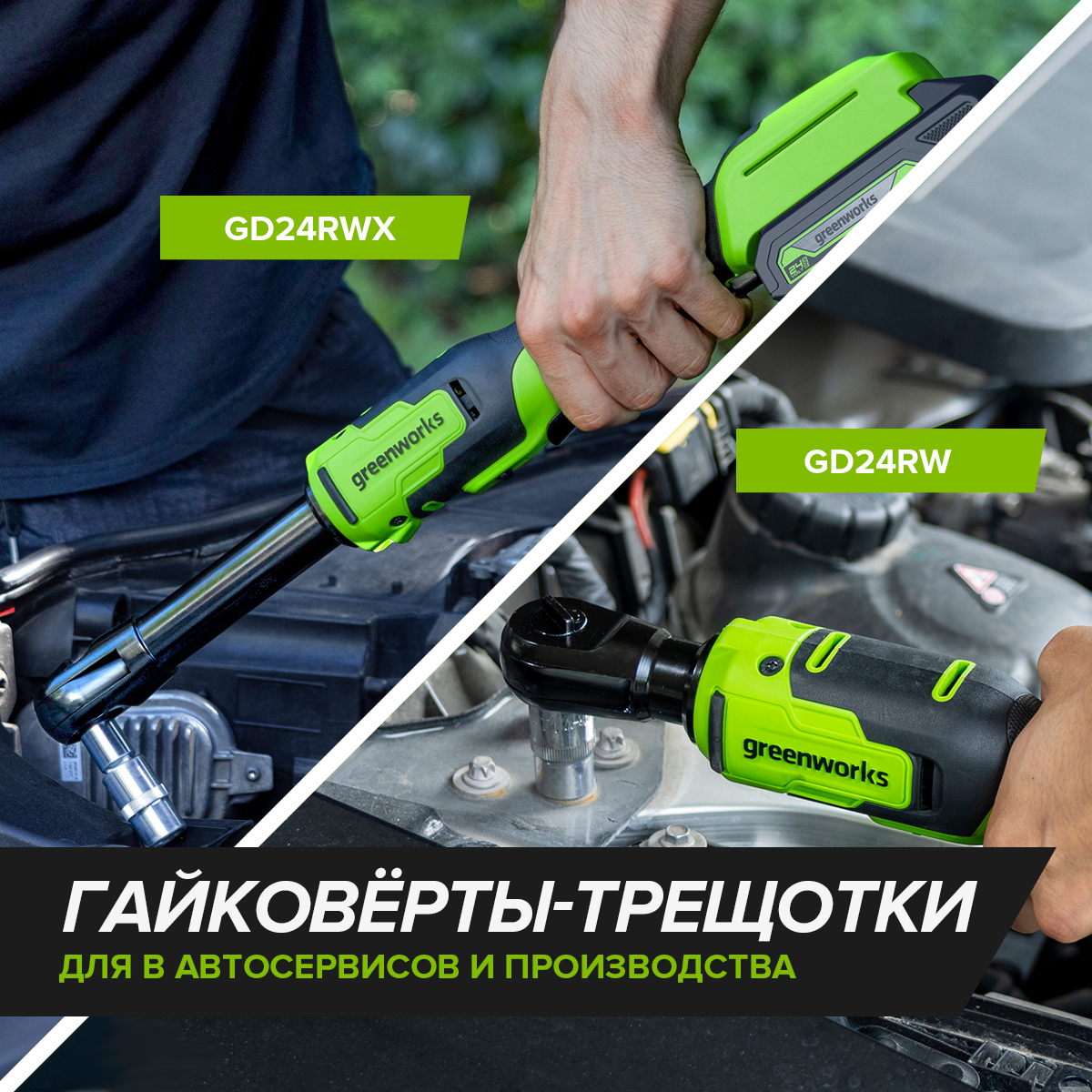 Новые аккумуляторные гайковёрты-трещотки Greenworks GD24RW и GD24RWX на 24V — удобные и эффективные инструменты для автосервисов и производств. Модели отличаются длиной редуктора — 70 мм у GD24RW и 170 мм у GD24RWX. Созданные для работы в труднодоступных местах, гайковёрты имеют удобную конструкцию и надёжный храповый механизм, которые позволяет использовать технику как стандартный ключ с трещоткой с максимальным усилием до 150 Нм. А долговечный бесщёточный двигатель DigiPro обеспечивает быструю работу с высокой повторяемостью результатов, что особенно важно на сборочных линиях. Специализированные инструменты подходят для работы с широким диапазоном резьбового крепежа до М18. Число оборотов регулируется до 250 об/мин. Надёжный механизм, защита от перегрузки, перегрева и случайного пуска повышают долговечность гайковёртов. А яркая LED-подсветка рабочей зоны делает работу ещё удобнее. Для инструментов предусмотрена прочная сумка, в которую удобно помещается как сам гайковёрт, так и аккум