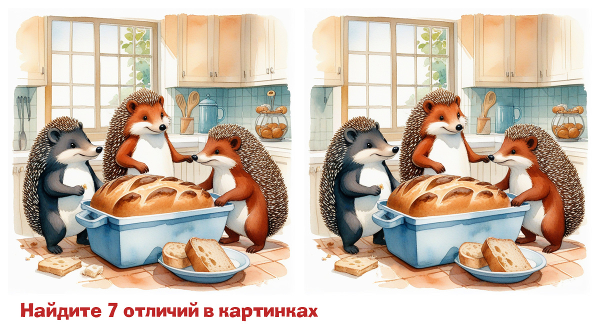 Как говорят пекари: "Внимательный глаз заметит и лишнюю щепотку дрожжей, и пропавший противень." Сегодня вечером Весёлая Ежиха и её друзья пекут свежий хлеб на тёплой кухне. Всё шло гладко: тесто месилось, дрожжи пахли, а разговоры не умолкали. Но что-то не так… То ли миска переместилась, то ли форма для хлеба исчезла? То ли мешок с мукой поменял своё место? Найди 7 отличий и помоги завершить выпечку. Горизонтальная картинка: Вертикальная картинка: Ты справилась на отлично! Ни одна деталь не ускользнула от твоего внимания. Найди потерянный фрагмент и пусть вечер будет таким же тёплым, как эта кухня. До новых встреч!