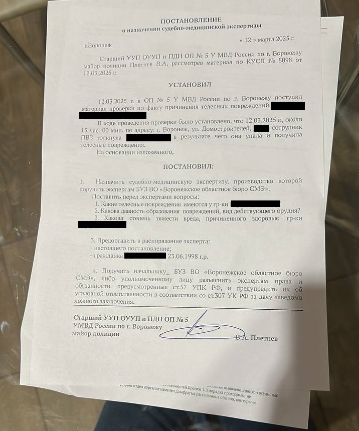 Читательница «Блокнот Воронеж» сообщила об инциденте, который произошел 12 марта на улице Домостроителей. По словам девушки, сотрудница пункта выдачи заказов толкнула ее с лестницы, та упала и получила травмы. «Я получила травмы. А именно шишка на голове, повреждение лопатки, а также многочисленные ушибы верхних конечностей. После того, как сотрудник намеренно столкнула меня с лестницы, она закрыла пункт выдачи и ушла. Медицинскую помощь вызывала самостоятельно после того, как пришла в себя», – рассказывает местная жительница. По словам девушки, сотрудница столкнула ее после просьбы дать ручку для жалобы в книге отзывов и предложений. Как говорит собеседница, после инцидента она написала заявление в полицию, его приняли и назначили судебно-медицинскую экспертизу, результаты которой направят в МВД. Филипп Котов