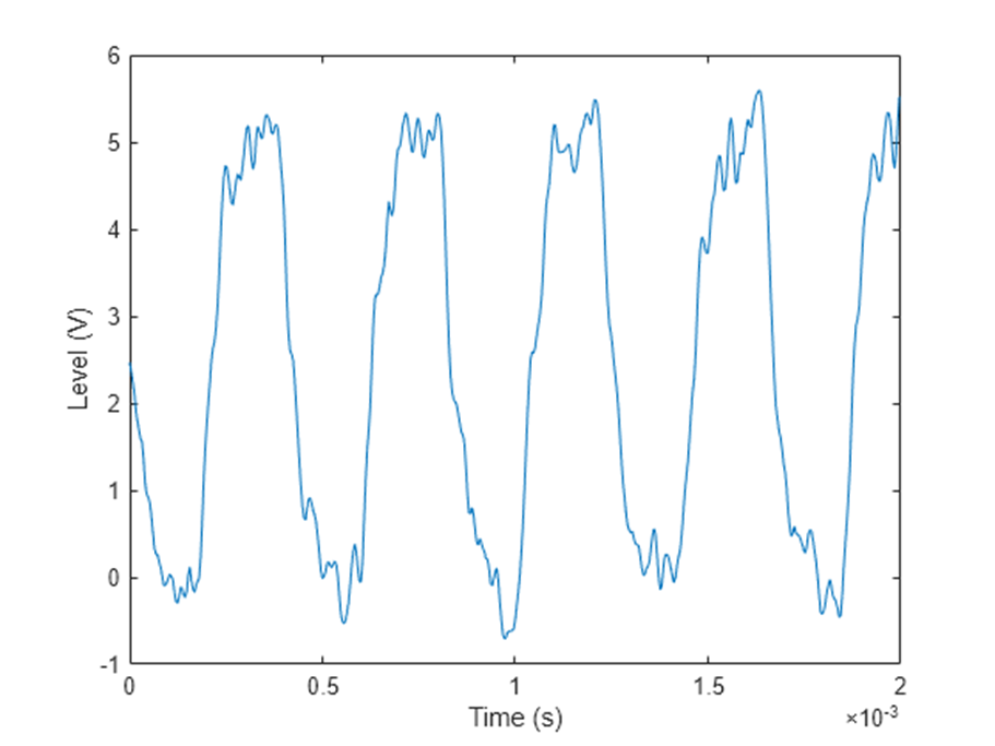 Как резко включается и выключается сигнал включения/выключения? Как часто и на какое время он активируется? Определите все эти характеристики для выхода тактового генератора. Загрузите сигнал и постройте график. Время измеряется в секундах, а уровень - в вольтах. load('clock.mat') plot(tclock,clocksig) xlabel('Time (s)') ylabel('Level (V)') Используйте statelevels, чтобы найти нижний и верхний уровни сигнала с помощью гистограммы. Если вы не указываете выход, функция строит график сигнала, отмечает уровни и выводит гистограмму. levels = statelevels(clocksig) statelevels(clocksig); Определите скорость нарастания сигнала при каждом переходе. Время нарастания использует нижний и верхний уровни, найденные с помощью statelevels. Он определяет время нарастания как время, необходимое сигналу, чтобы подняться с 10 % до 90 % разницы между уровнями. [Rise,LoTime,HiTime,LoLev,HiLev] = risetime(clocksig,tclock); Levels = [LoLev HiLev; (levels(2)-levels(1))*[0.1 0.9]+levels(1)] Если вы вызываете ri