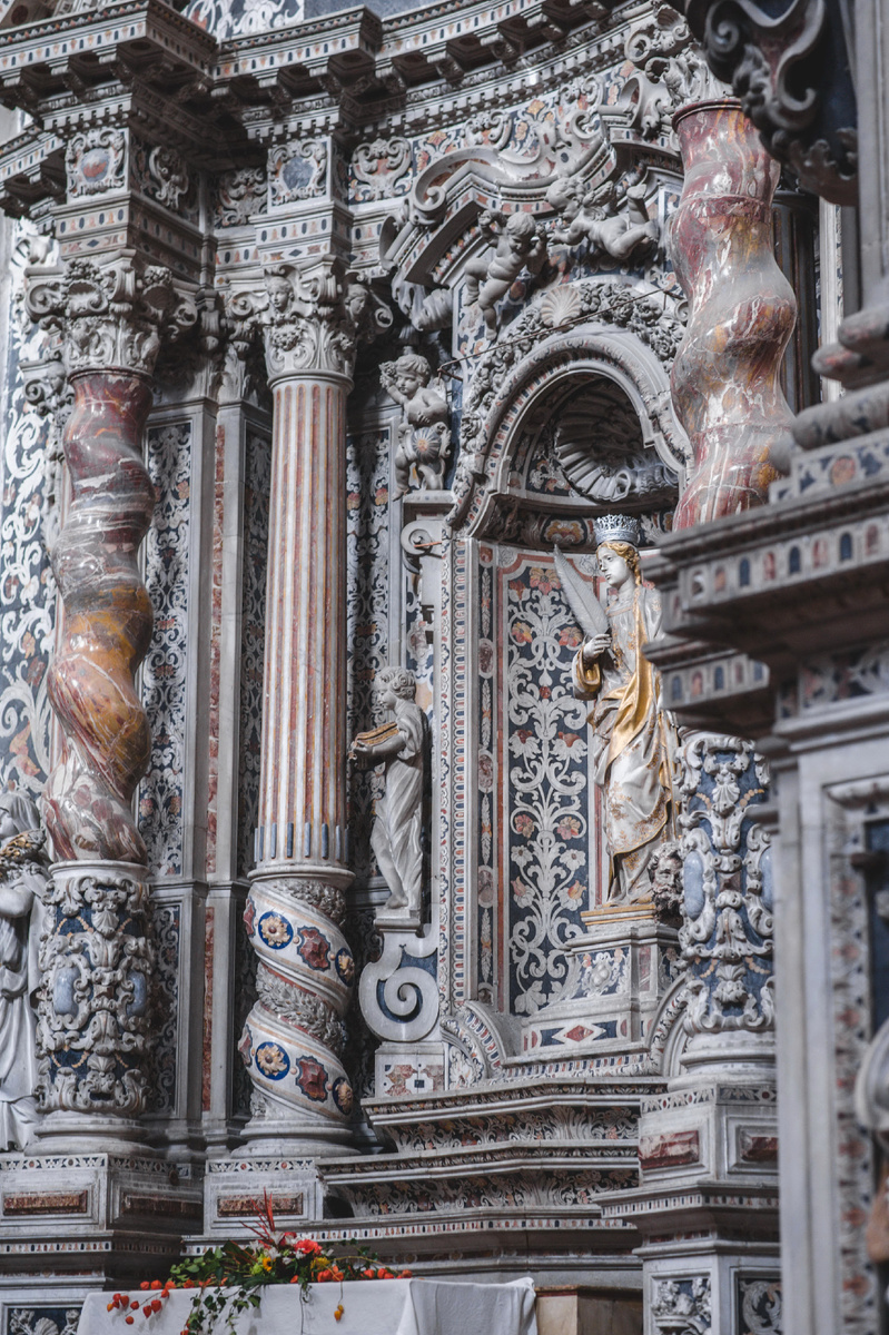 Здесь спрятан младенец, о котором говорят даже те, кто никогда не ступал в храм. Его создал мастер Чираро в XVII веке — тонкая работа, почти слишком живая.