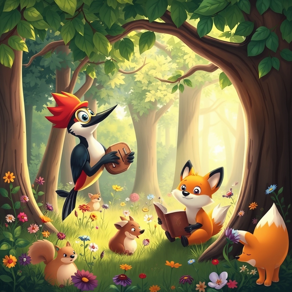 В сердце величественного леса, где деревья тянулись к небесам, а реки звенели, как чистейшая музыка, жил дятел по имени Даниил. Каждый день он стучал своим клювом по деревьям, создавая мелодии, которые наполняли лес жизнью и радостью. Его ярко-красная шапочка была словно маяк, известная всем лесным жителям. Одним солнечным утром, когда Даниил трудился над новой композицией на старой березе, к нему подошла лиса по имени Лера. Лера была известна своей хитростью и умом, но больше всего она мечтала об удивительных приключениях и новых знакомствах. — Привет, Даниил! — приветливо сказала она, усаживаясь под деревом. — Ты всегда так занят своими мелодиями. Почему бы тебе не попробовать что-то новое и не поиграть со мной? Даниил остановился, слегка удивленный предложением. Он никогда не думал, что лиса может заинтересоваться его музыкой. — Здравствуй, Лера! — ответил он с дружелюбной улыбкой. — Но я не умею играть в игры. Моя страсть — это музыка. Лера задумалась и предложила: — Давай