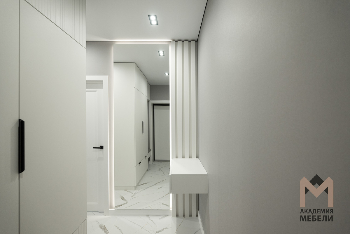 Наш новый проект по адресу Новгородский, 176 – мебель в прихожую в современном стиле. ЖК Зелёный Квартал. Прихожая в современном стиле – элегантное и функциональное решение для организации пространства в вашем доме. Прихожая – это первое помещение, которое видят гости и хозяева по возвращении домой. Именно поэтому так важно правильно организовать это пространство и создать эстетичную обстановку. Как в нашем новом проекте. У самого входа в помещение размещена зона быстрой раздевалки с пуфом. Задняя панель выполнена из плиты МДФ и оформлена пристенными рейками, на которые, в свою очередь, крепятся крючки для одежды. Мы замкнули вертикаль антресольным модулем: в этом модуле скрыта серверная зона. Сразу за открытой зоной следует функциональная: распашной двухдверный шкаф, который служит в качестве гардеробной зоны. В этом случае мы разделили дверцы на три части: антресольные, основные, и нижние. Нижний отсек отделен от основной зоны: он предназначен для хранения сезонной обуви. Прямо напро
