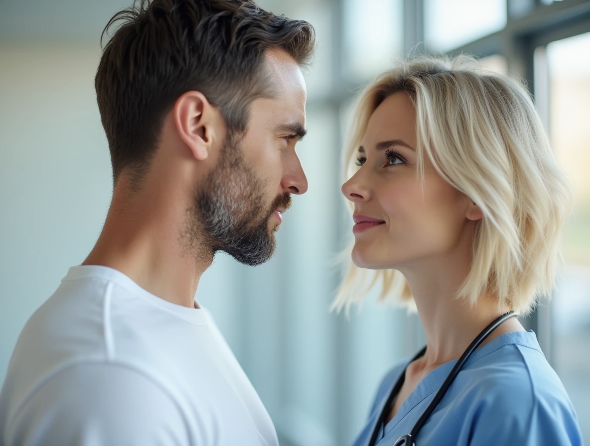 Я ловлю себя на том, что жду её шагов в коридоре, её голоса. Уколы, процедуры, капельницы — всё это становится не просто лечением, а поводом увидеть её. Она замечает. Я вижу это по тому, как она задерживает взгляд, как поправляет волосы, когда думает, что я не смотрю. И внутри у меня война.