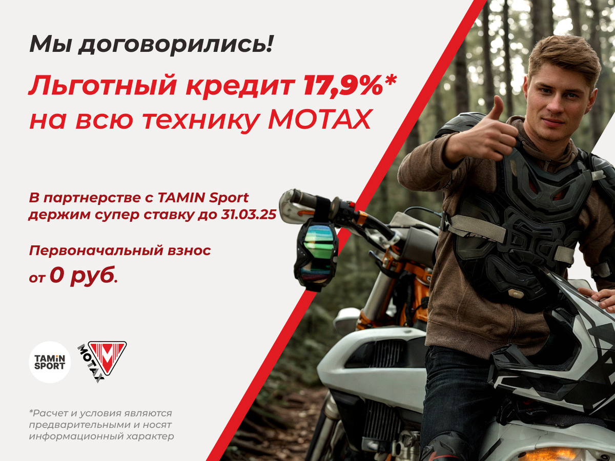 Стала доступна новая программа, позволяющая приобрести технику MOTAX в кредит с возможностью индивидуального подбора условий. Условия программы: 🔹Ставка — 17,9% 🔹Срок — от 10 до 24 месяцев 🔹Первоначальный взнос — от 0 до 40% Ключевые особенности программы: 🔹Рассмотрение заявки сразу в нескольких банках-партнёрах 🔹Для подачи нужен только паспорт 🔹Заявка оформляется полностью дистанционно — из любого региона России 🔹Подписание договора возможно как в салоне, так и дома или на работе 🔹В кредит можно оформить сразу несколько единиц техники 🔹Время рассмотрения — 20 минут Программа уже действует, связаться с нами можно по телефону +74951207728 или напишите нам в Телеграме @tamin_sport
