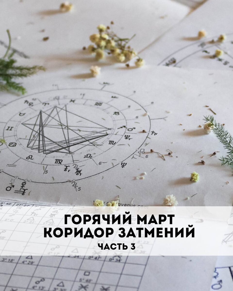 Ну вот мы и добрались до 3 части нашего горячего марта - коридора затмений. Затмения : Лунное - 14 марта 24° Девы Солнечное - 29 марта 9° Овна Вход Нептуна в Овен 30 марта. Коридор начнется с Лунного затмения которое произойдет 14 марта. Его особенностью является соединение Солнца с Сатурном и Нептуном. Это первое затмение по оси Дева — Рыбы за последние 18 лет. Оно поднимет как глобальные темы, такие как гуманизм и служение, так и обычные - работа и безработица, здоровье, использование тонких технологий на стыке наук/медицины. В эмоциональном плане сложный день, сильные колебания настроения, обострение проблем со здоровьем. Солнечное затмение 29 марта в 9° Овна несет энергетику прошлых двух лет, когда затмения происходили по оси Овен — Весы, и будет завершать воинственные овновские темы. Завершение вряд ли придется на само затмение: скорее, итог не стоит ждать раньше весны — лета 2025 года. В сами дни затмения важно беречь здоровье, не перенапрягаться. Хорошо продумывать планы