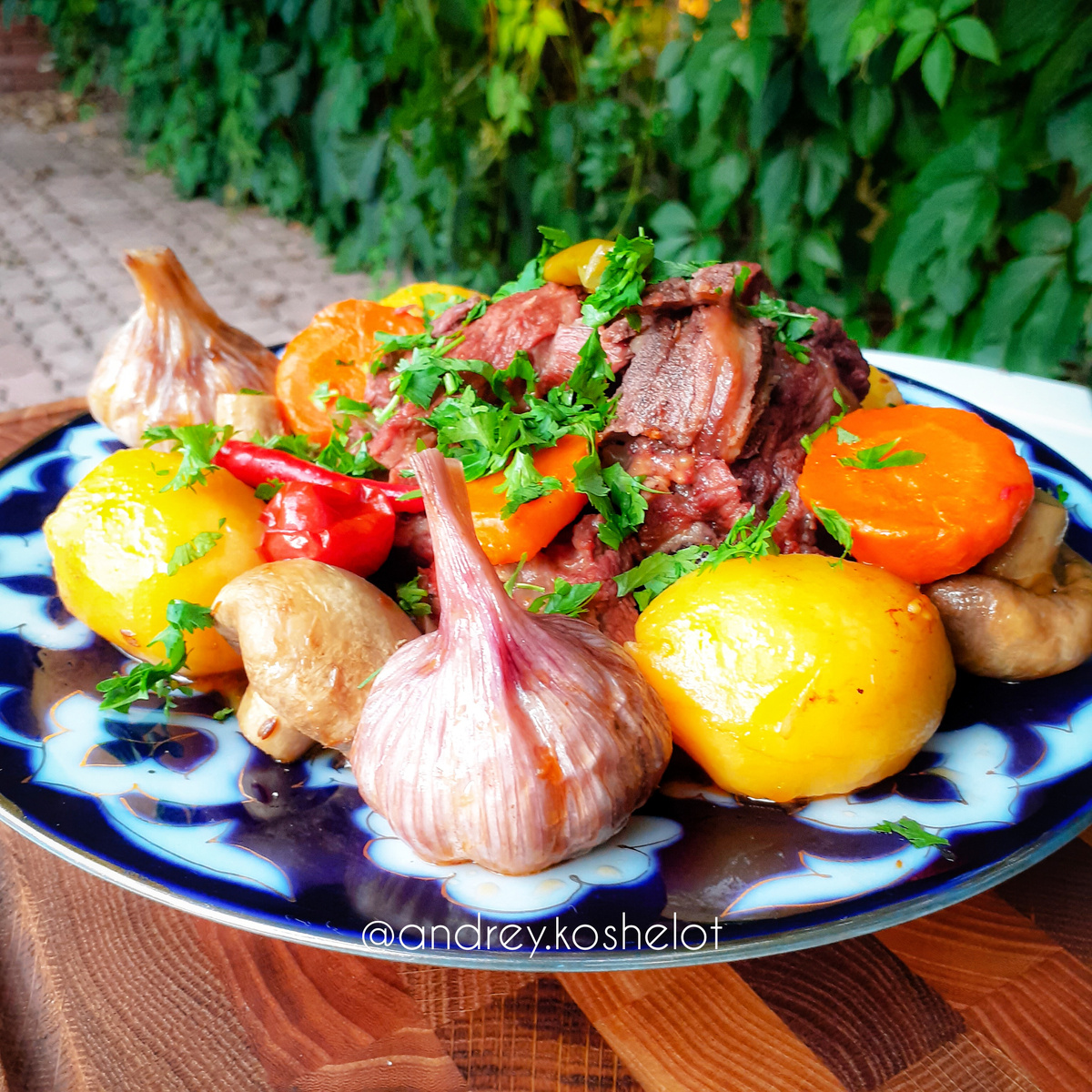 Конечно вкусно и на плите, но дымок делает свое дело! - Говядина или баранина на кости – 2 кг; - Картофель (средний) – 1 кг; - Шампиньоны (средние) – 0,5 кг; - Лук – 0,5 кг; - Морковь – 0,5 кг; - Томаты – 0,5 кг; - Черри – 200 гр; - Чеснок молодой – 3 головки; - Перец стручковый – 1-2 шт; - Масло растительное – 200 мл; - Масло топленое или курдюк – 100 гр; - Вода – 300 мл; - Зелень свежая: кинза, петрушка. По вкусу; - Специи: зира, черный перец крупного помола, соль, сахар. Количество по вкусу. 1. Нарезаем мясо довольно крупно. Лук режем на полукольца, морковь – на толстые кольца, томаты – на крупные дольки. 2. На сильном огне в казане растапливаем масло или курдюк. 3. Выкладываем мясо и обжариваем 10 минут. Затем добавляем лук и морковь. Посыпаем растертой зирой, перчим, солим. Жарим еще 10 мин на сильном огне. 4. Закидываем помидоры с доба