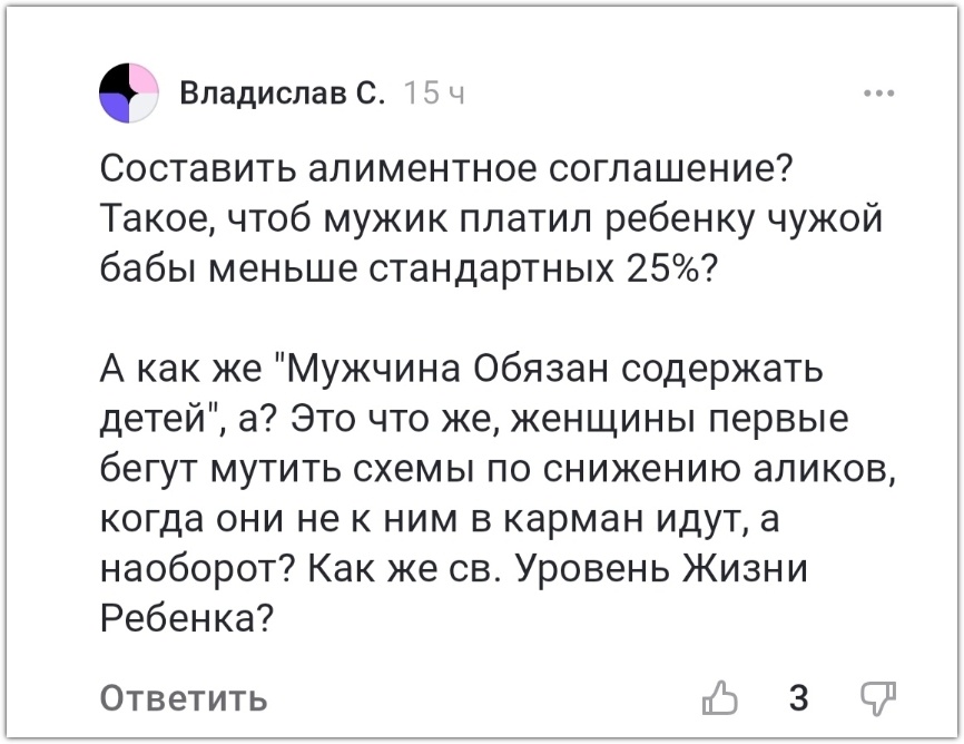 Ваши комменты к посту о том, что делать, если у любовницы ребёнок от вашего мужа, не разочаровали. Особенно от мужчин, которые снова обвинили жену и попеняли ей на то, что она стремится снизить алименты, ущемляя ребёнка на стороне. Спешу разочаровать Владислава двумя вещами: 1. Нотариус будет выяснять, что там у мужчины по заработкам. И если соглашение будет явно устанавливать "ущербные" суммы алиментов ниже этих 25%, то такое соглашение вряд ли будет удостоверено. Даже в ТДС. Поэтому особо снизить их путём соглашения не получится. 2. Мужчина обязан содержать детей - это правило не отменили. Мутить или нет схемы по снижению "аликов" мужчина будет независимо от наличия/отсутствия шипящей жены под боком - всё зависит от наличия стали в его тестикулах порядочности и ответственности перед всеми, кого он "родил" и пригласил в свою жизнь. Или вы думаете, что мужчина лишь исполнитель воли жены, Владислав С.? Тогда у меня для вас плохие новости. Если же мужчина начинает бездумно плодиться