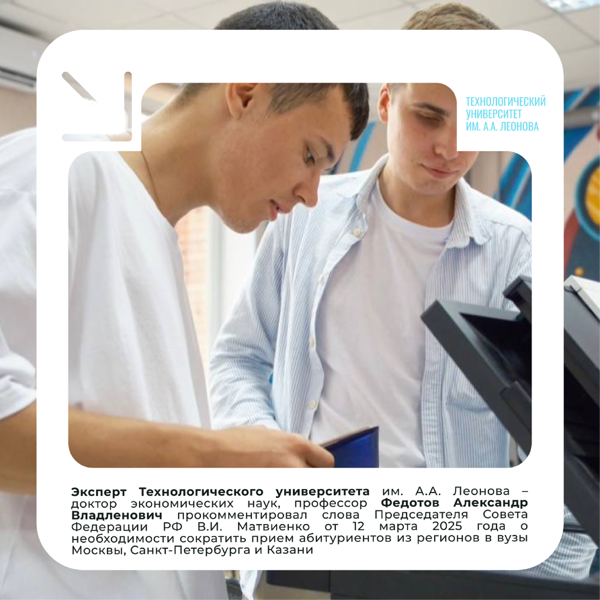 Комментарий к словам Председателя Совета Федерации РФ В.И. Матвиенко от 12 марта 2025 года о необходимости сократить прием абитуриентов из регионов в вузы Москвы, Санкт-Петербурга и Казани доктора экономических наук, профессора Технологического университета им. А.А. Леонова Федотова Александра Владленовича Обеспокоенность Председателя Совета Федерации В.И. Матвиенко, о том, что выпускники столичных вузов остаются в Москве и не возвращаются в регионы понятна. Данную инициативу можно приветствовать и обсуждать эту проблему на государственном уровне. Однако, данная проблема лишь следствие сложившихся обстоятельств, причина,заставляющая иногородних выпускников,оставаться в Москве заключается в том, что иногородние выпускники столичных вузов, устроившись на работу в Москве, даже и не по специальности, получают зарплату значительно превышающую зарплату в регионах. Также, в дальнейшем, оставшись в Москве, они смогут получать более высокие чем в регионах социальные выплаты для себя и член