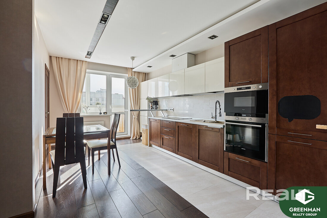 В пятнадцати минутах от станции метро «Каменная Горка» на продажу выставили просторную двушку с кухней площадью 14 квадратов и большой лоджией. Планировка в этой квартире не самая характерная для этого района. Квадрат выходит дороже двух тысяч долларов. А сколько стоит и как выглядит квартира? Двушка расположена на девятом этаже 23-этажного каркасно-блочного дома 2011 года постройки по адресу Колесникова, 16. Это микрорайон Домбровка, до станции метро можно дойти минут за 20 или доехать общественным транспортом за 10. Вот расположение на карте. А вот сам дом — он справа. Большие лоджии заметны уже с улицы. Общая площадь двушки — 62 квадрата, жилая — 30 метров, а площадь кухни — 14 квадратов. Перепланировка в квартире узаконена. Между кухней и гостиной нет дверей, но это две полноценные комнаты. В кухне есть духовой шкаф, варочная панель, вытяжка и другая техника. Мебель выполнена из ольхи. В гостиной стоит диван, а на стене висит телевизор. По всей квартире сделаны теплые полы — керамо
