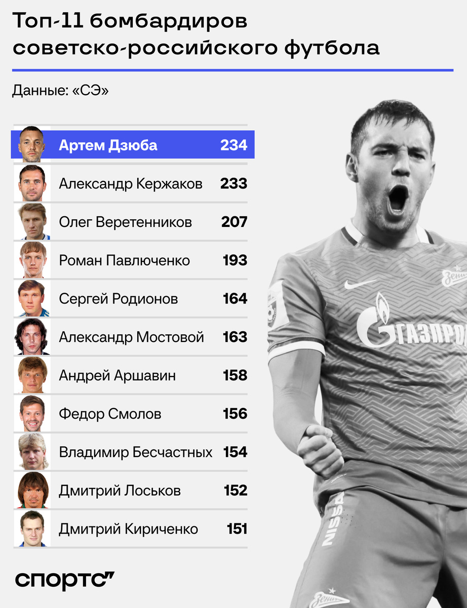 Это значит, что достижение Дзюбы, несомненно, историческое. В ближайшие годы к нему и Кержакову никто не подберется: 35-летний Федор Смолов максимум обгонит Сергея Родионова со 164 голами, почти 34-летний Кокорин может не достать и до 150, а остальные не разменяли и 100 мячей.