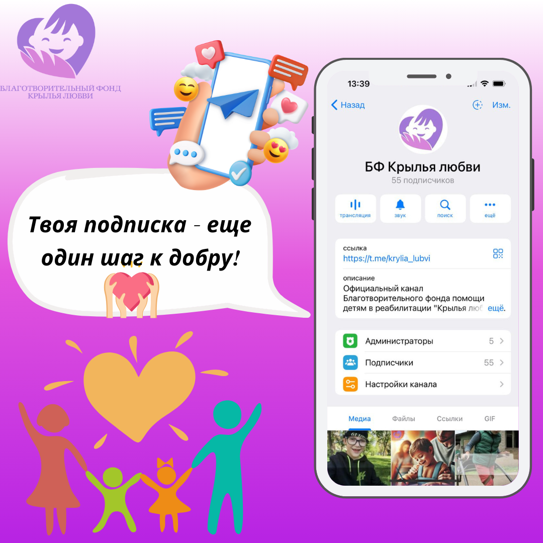 📢 Напоминаем, что наш фонд есть в Telegram! 💙 Если вы еще не с нами, самое время подписаться! В нашем канале — актуальные новости, истории подопечных, отчеты и способы помочь. Будем рады видеть вас среди подписчиков! Давайте вместе делать добро. ✨ 🔗 Присоединяйтесь: t.me/krylia_lubvi #благотворительность #помощьдетям #фонд #новости #дети #семья