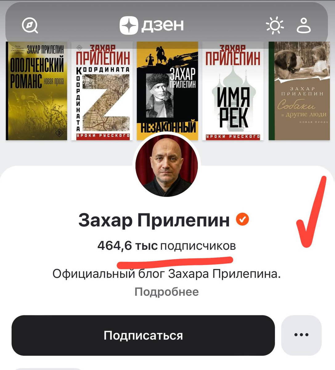 1. НЕВЕРОЯТНЫЕ | Захар Прилепин | Дзен 300 000 Про героев. И недомужиков в тылу. 2. "Я КРАСНЫМИ ПО ГОРЛО СЫТ!". БРАТАН, КАКИМИ КРАСНЫМИ ТЫ СЫТ? УСПОКОЙСЯ УЖЕ, ИДИ В ШКОЛУ УЧИСЬ. | Захар Прилепин | Дзен 188 000 Про повторяющих всякую ерунду. 3. ОТКРЫТИЯ | Захар Прилепин | Дзен 160 000 Про Долиных в изгнании. 4. РЕЧЬ, ПОТРЯСШАЯ МИР | Захар Прилепин | Дзен 146 000 Как Америка открыла себя. 5. КАК ГАГАРИН В КОСМОС | Захар Прилепин | Дзен 61 000 Про наших. 6. ПАУЗА ДЛЯ ЛОХОВ | Захар Прилепин | Дзен 37 000 Про миролюбие Трампа. 7. СОВЕТСКОЕ НЮ, КАК БАЛЕТ - ЛУЧШЕЕ В МИРЕ | Захар Прилепин | Дзен 33 000 Про ню. 8. УТОМЛЯЕТ | Захар Прилепин | Дзен 32 000 Про Лимонова. 9. ОСОБЫЙ ТИП ЧЕЛОВЕКА | Захар Прилепин | Дзен 22 000 Про советского человека. 10. ЗАХАР ПРО ЛИМОНОВА. ОТКРОВЕННО | Захар Прилепин | Дзен 21 000 Про Лимонова ещё раз.
