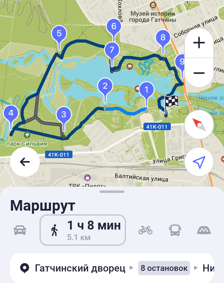 Добраться до дворца несложно. Садимся на электричку, отходящую от Балтийского вокзала (станция метро «Балтийская»), и через час прибываем на станцию Гатчина — сюрприз — тоже Балтийская. Прямо от станции ко дворцу (на прилагаемом скриншоте с навигатора обозначен номером 1) ведет трехсотметровая аллея имени Павла I. Время нужно подгадывать с тем рассчетом, чтобы после посещения музея его хватило на осмотр парка. Пусть и не такой большой как Павловский, он для добротного обхода потребует несколько часов.