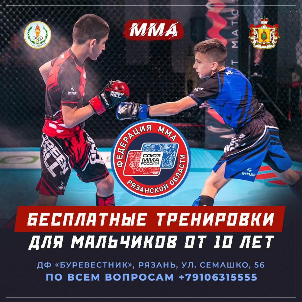 Открыт набор на бесплатные тренировки для детей и подростков по смешанному единоборству ММА. Занятия проводятся под эгидой Федерации ММА Рязанской области. Учите мальчиков с детства быть смелыми, выносливыми и готовыми постоять за себя, свою семью и Родину! Регулярные тренировки помогут обрести уверенность, научат контролировать эмоции и находить выход из сложных ситуаций. Занятия проходят в ДФ «Буревестник» по адресу: Рязань, ул. Семашко, 56. Все подробности можно узнать по телефону +7910-631-55-55 Не откладывайте на завтра то, чему можно научить своих детей уже сегодня Русская община | Рязань. Присоединяйтесь!