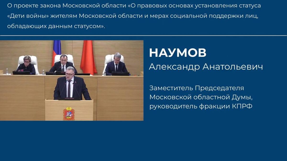 Руководитель фракции КПРФ Александр Наумов выступил на 107 заседании Мособлдумы с законопроектом «О детях войны»: