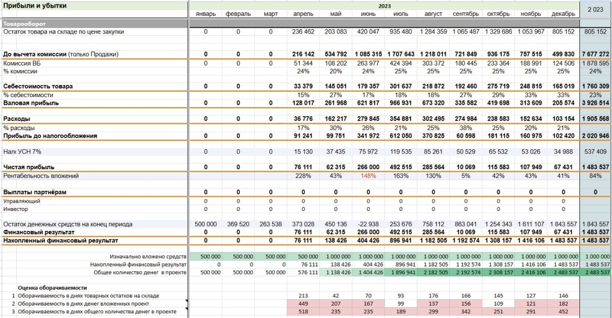 Проектом по факту мы называем капитал, который в работе у управляющей команды, бывает так что на одном кабинете несколько проектов, так как разные источники финансирования этих товаров. Так вот самый простой способ оценки оборачиваемости проекта это расчет исходя из себестоимости проданного товара (строка 29). Но вот вопрос по отношению к чему ее оценивать. Разберем несколько вариантов на примере управленки сезонного проекта из которого не выводились деньги: https://docs.google.com/spreadsheets/d/18r6B18G2L0t7_9U7ve8xIZ7JaAQi3ELi4o5IAO9BdpY/edit?gid=1072240350#gid=1072240350 1. Оборачиваемость в днях товарных остатков на складе (строка 70) Тут получается самое низкое значение оборачиваемости и отражает по факту на сколько затарен склад при данной скорости продаж. На примере видно как много остатков привезли в конце сезона и их оборачиваемость под конец года держится на одном уровне, по факту падение динамики продаж пропорционально падению скорости продаж. 2. Оборачиваемость в днях
