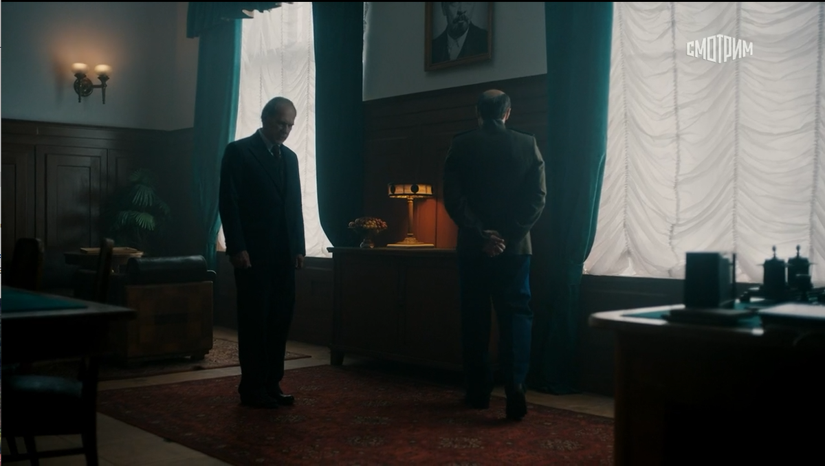 Иллюзия о таком заботливом руководителе, который переживает за своих сотрудников, рушится после слов Берии о том, что если Замятиным как то напортачит, то за это, спросится с его семьи. Замятин ничего не говорит на это, он просто благодарит Берию, за хороший грузинский коньяк.